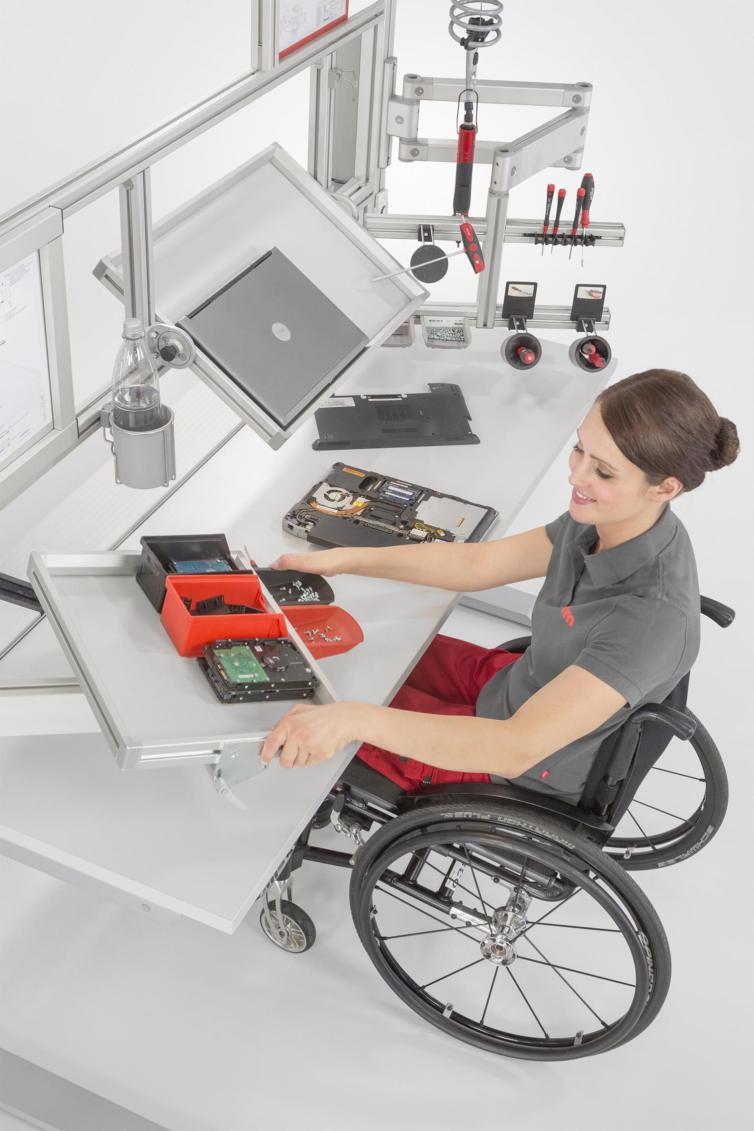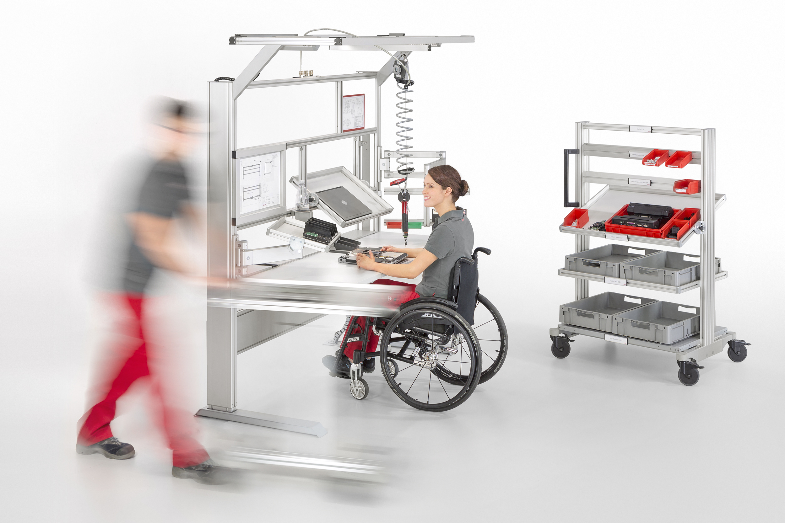 Highly qualified, motivated and nevertheless unemployed. This is often the reality for people with disabilities. But a disability doesn’t automatically mean restricted working capacity – rather conventional work benches often present an obstacle that needs to be overcome if we are to achieve inclusion. State-of-the-art and flexible systems can help create a disabled-friendly working environment and provide employees with the exact support they need, thus counteracting any motor deficits and restricted movement.