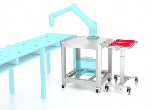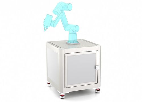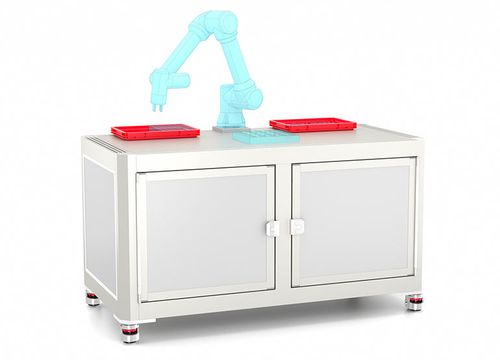 EX-01581The work surface of this robot workstation has numerous continuous grooves that are open at the sides. This allows fixtures and tools to be easily slid on at the front and fixed to fit.